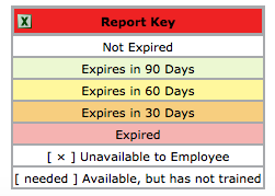 Training Matrix – This feature is designed to provide you an adjustable visualization of employee training. Employee names are listed on the left and course names are listed across the top. If an employee has completed a course, the date of that completion is posted where the employee name and the course name meet. The matrix identifies when a training or certification has expired and needs to be redone. When viewing the matrix you can click on any employee name, course name, or training completion date for additional information. Matrix results can easily be copied and pasted into Excel spreadsheets for further customization.